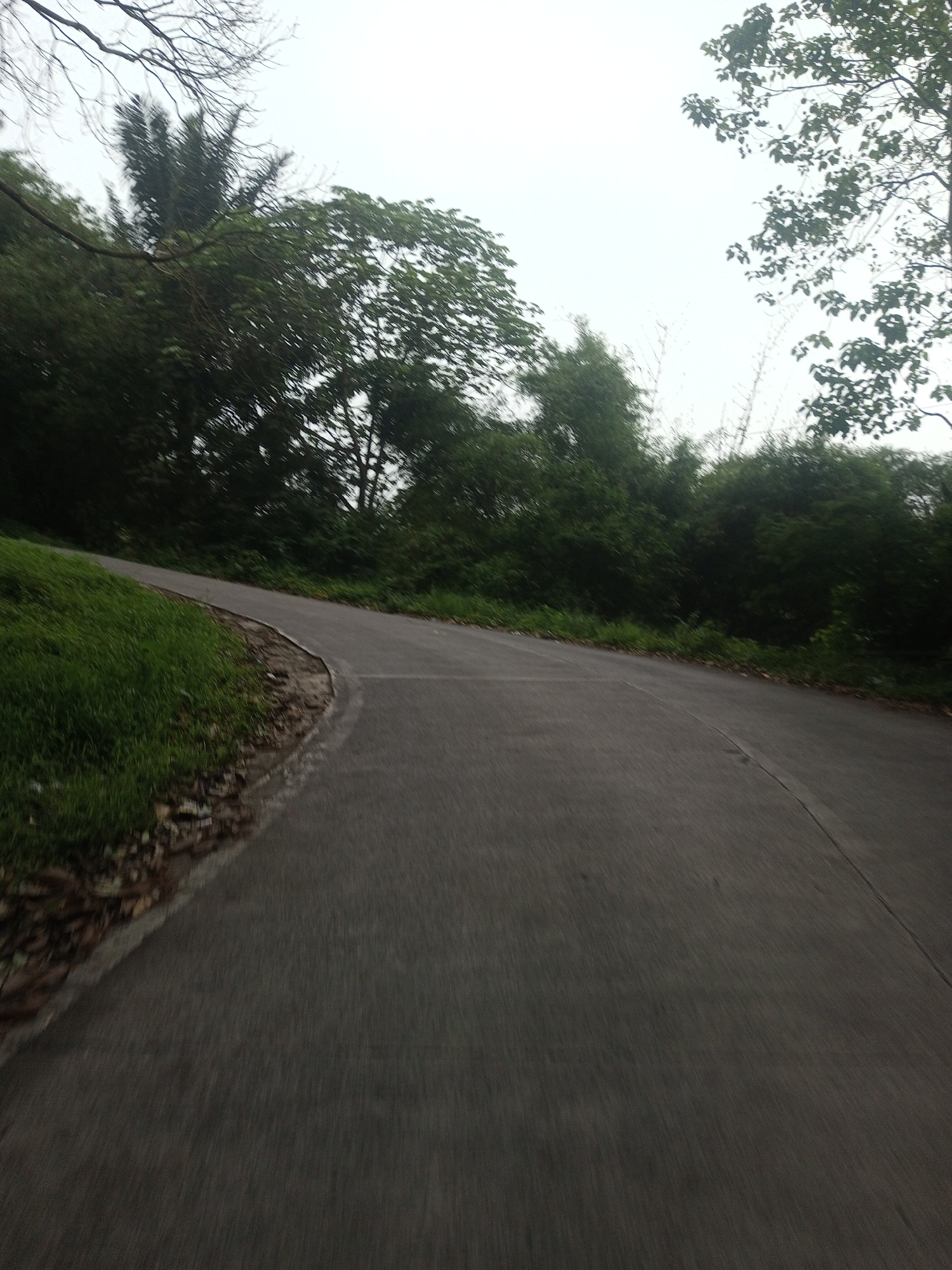 The image displays a dark grey paved road curving to the right in Kan Beit, Myanmar. The road is bordered on the left by a steep, vibrant green grassy embankment, transitioning to a narrow strip of brown earth with scattered dry leaves before meeting the asphalt. Dense green foliage and trees line both sides of the road, extending into the background. Specific arboreal elements include visible palm-like fronds and some bare tree branches against a uniformly light grey, overcast sky. The road surface and some foreground elements show motion blur, indicating capture during movement. No human figures, animals, or vehicles are present.