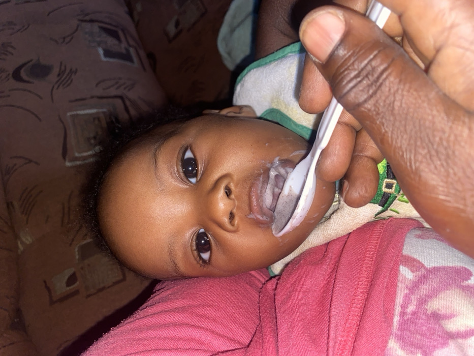 An indoor scene in Rido, Nigeria, depicts an infant being spoon-fed by an adult