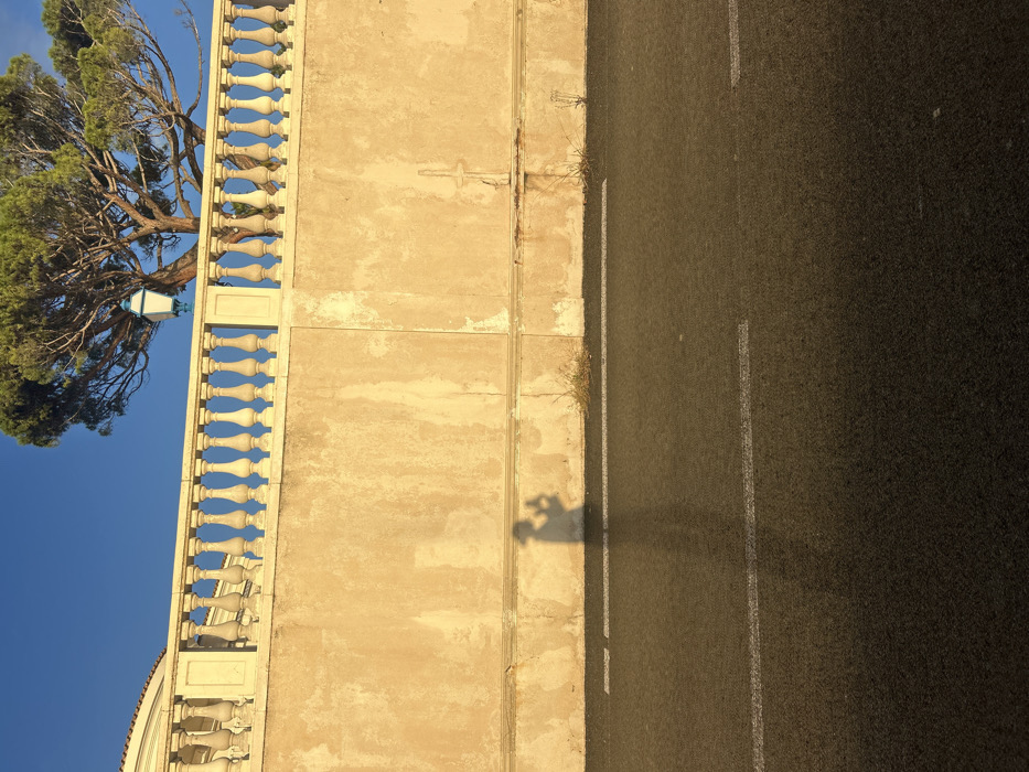 The image displays a roadside scene in Antibes, France, captured during golden hour. A dark asphalt road, marked with two parallel dashed white lines, occupies the foreground. An elongated shadow of a person, wearing headwear and holding an object to their face (consistent with a camera or phone), is cast on the lower left portion of an aged, textured beige wall and extends onto the road. This wall occupies the mid-ground, showing discoloration and cracks, with sparse dry vegetation at its base. Above the wall, a light-colored balustrade with multiple balusters is visible. Behind the balustrade, a portion of a curved, light-colored building is on the far left, while a large pine tree with dark green foliage and a visible trunk dominates the right side. A single street lamp with a white lantern and dark base is mounted behind the balustrade near the tree. The upper background features a clear, deep blue sky. Strong, warm sunlight originates from the left, casting long shadows and illuminating the scene.