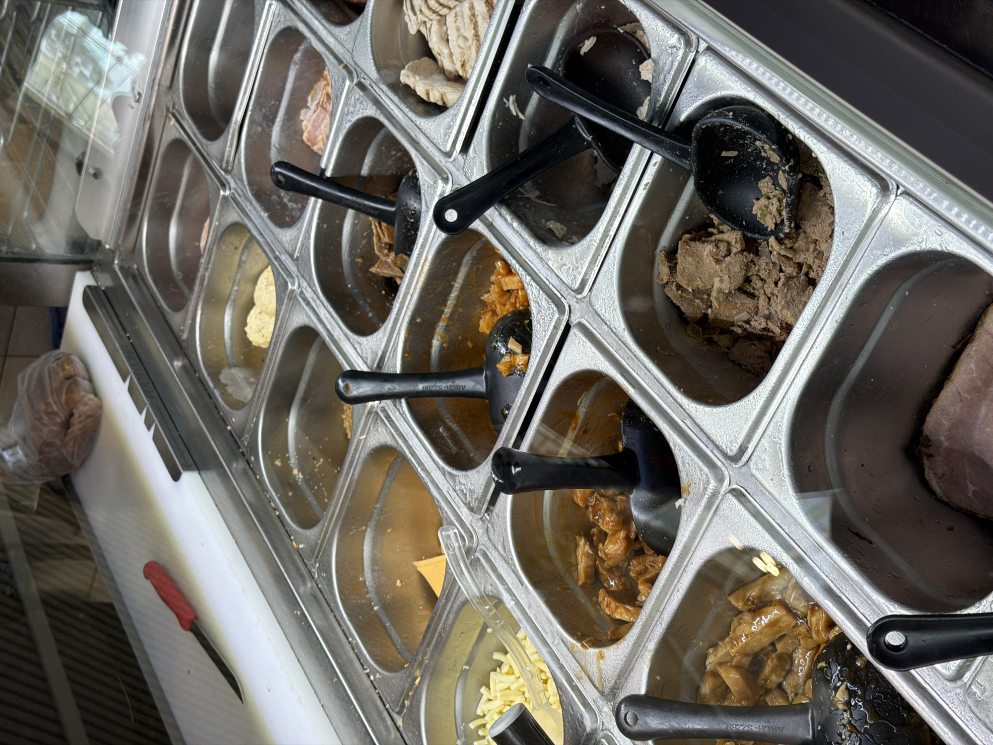 This image depicts a commercial food display counter in ตำบล ไม้ขาว, Thailand. The foreground is dominated by a grid of stainless steel food pans, commonly used in buffet or sandwich bar setups. From left to right and top to bottom: * The top-left area behind a clear glass partition features a white cutting board with a red-handled utility knife resting on it. A plastic-wrapped food item is partially visible behind the glass. * The upper row of food pans (partially visible) contains a creamy yellow spread, and sliced pink processed meat. * The second row includes a pan filled with shredded yellow cheese sticks, an empty pan, a pan with an orange-colored stew containing diced items (possibly vegetables or fruit), and a pan with a dark brown, chunky mixture. * The third row contains a pan of light-colored meat pieces in a brown sauce, an empty pan, a pan with grilled chicken strips, and a pan with a brownish, textured paste or spread. * The bottom row (partially visible) shows a large slab of dark pink meat in a pan. * Numerous black plastic serving spoons are present in many of the filled food pans. * The stainless steel surfaces exhibit minor condensation or moisture. No individuals are visible in the scene. The overall environment suggests a clean, prepared food service area.