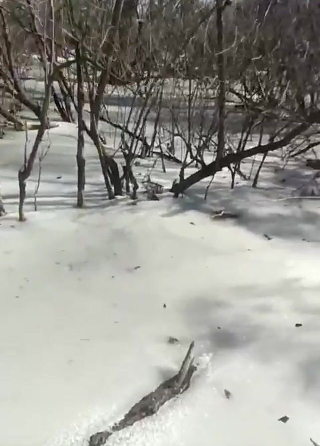 frozen, snow-covered ground with leafless trees emerging from it. The trees are bare, with thin, dark branches creating a dense network. The ground is covered in a layer of white, appearing to be either snow or ice. The environment suggests a winter scene in a wooded area or park. Intermittent crunching sounds are audible.