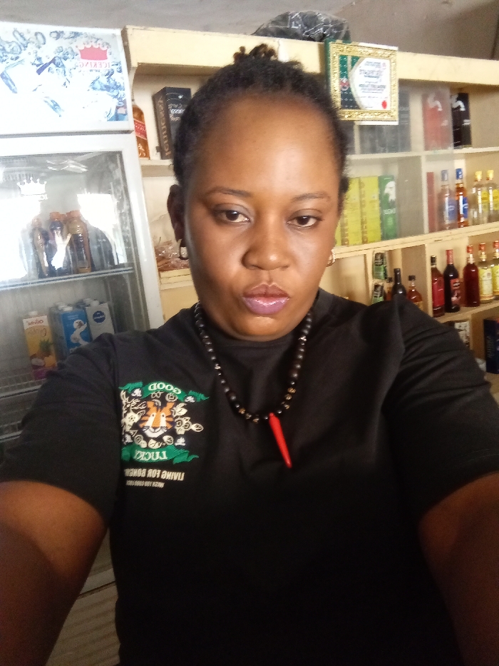 In an indoor commercial establishment located in Sabon Gari West, Nigeria, a dark-skinned woman is captured in a medium shot, directly facing the camera with a neutral expression and slightly pursed lips. She wears a black t-shirt featuring a green and white graphic that includes "GOOD LUCK" and a stylized tiger, with inverted text below. A dark beaded necklace with a prominent red, pointed pendant rests on her chest. Her dark hair is pulled back, and she wears small hoop earrings. To the left of the subject, a white commercial refrigerator with a glass door displays various bottled beverages, including juices and possibly milk cartons. An advertisement with a crown logo is affixed to the top of the refrigerator. Behind and to the right of the subject, light-colored wooden shelving units are visible, stocked with numerous bottles of alcoholic beverages of varying shapes and colors. A framed certificate or award with a green and gold border is mounted on the wall between two shelves.