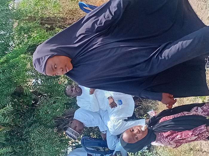 A group of people gathers outdoors. Two women are wearing hijabs, one in solid dark blue and the other in a patterned pink and black fabric. Three men are dressed in white. One man wears a traditional white cap. Trees and foliage are visible in the background. A portion of a blue plastic chair is visible on the left. The picture is taken at an angle.