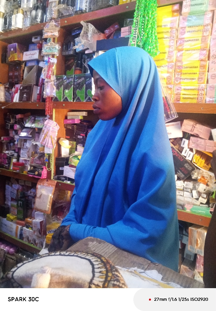 An individual, identified as a young adult Black female, is depicted in profile, facing left within an indoor retail shop in Akwanga, Nigeria