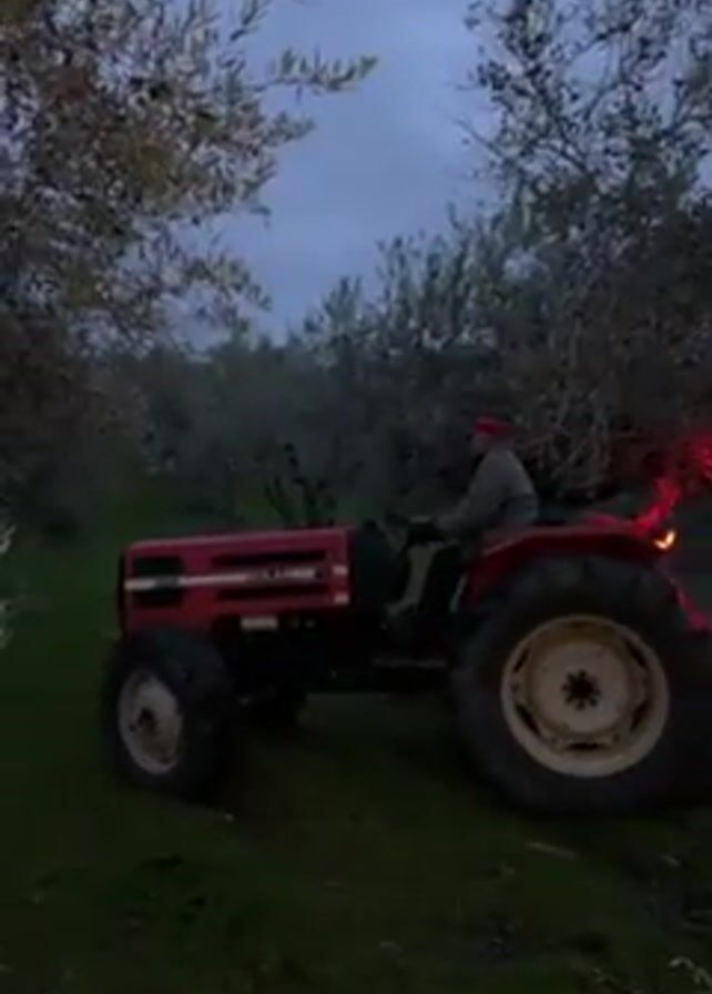 red tractor with a man driving it through an olive grove. It is dusk or early morning, and the sky is overcast. The tractor has its rear lights on. The ground is grassy.