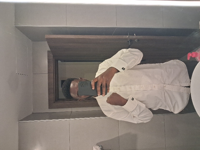 A male individual is observed in a mirror selfie within what appears to be a bathroom. The subject has dark skin and short, dark curly hair. A dark-colored smartphone is held in the right hand, obscuring the subject's face. The subject wears a white collared shirt with long sleeves and dark cuff links, and dark trousers. The left hand is clenched into a fist at chest level. The environment includes light grey or beige tiled walls, a partially visible wooden door slightly ajar in the background, a white ceramic sink basin in the foreground, and a pink pump bottle (likely soap dispenser) on the counter. The image captures a personal moment in a private setting, presumed to be in Takum, Nigeria.