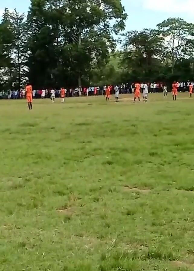 soccer match played on a grassy field. The players are wearing orange and white uniforms. There is a crowd of people watching the game. The camera pans across the field showing players, spectators, and the surrounding environment with trees. There is a water tower in the distance.