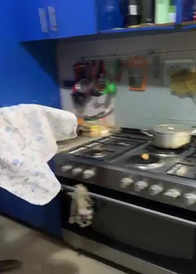 A person, presumably female, wearing a short-sleeved top and dark bottoms is walking in a kitchen. The person has a white floral patterned cloth draped over their shoulder, partially obscuring their upper body. The kitchen features blue cabinets, a speckled granite countertop, and a stainless-steel gas stove. Pots and a frying pan are on the stove, with food visible in the frying pan. A chair is visible to the left.