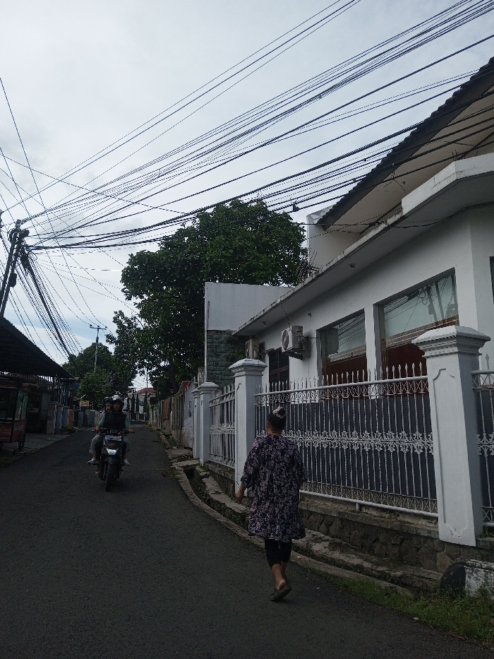 A residential street scene presents an overcast sky tangled with overhead wires. A woman walks away from the viewer on the right side of the road, adjacent to a white fenced property. A motorbike with two riders approaches in the distance. The street is dark asphalt, flanked by sidewalks and fences. Buildings are visible, including a white structure with dark-framed windows. A large tree adds a touch of greenery to the scene.