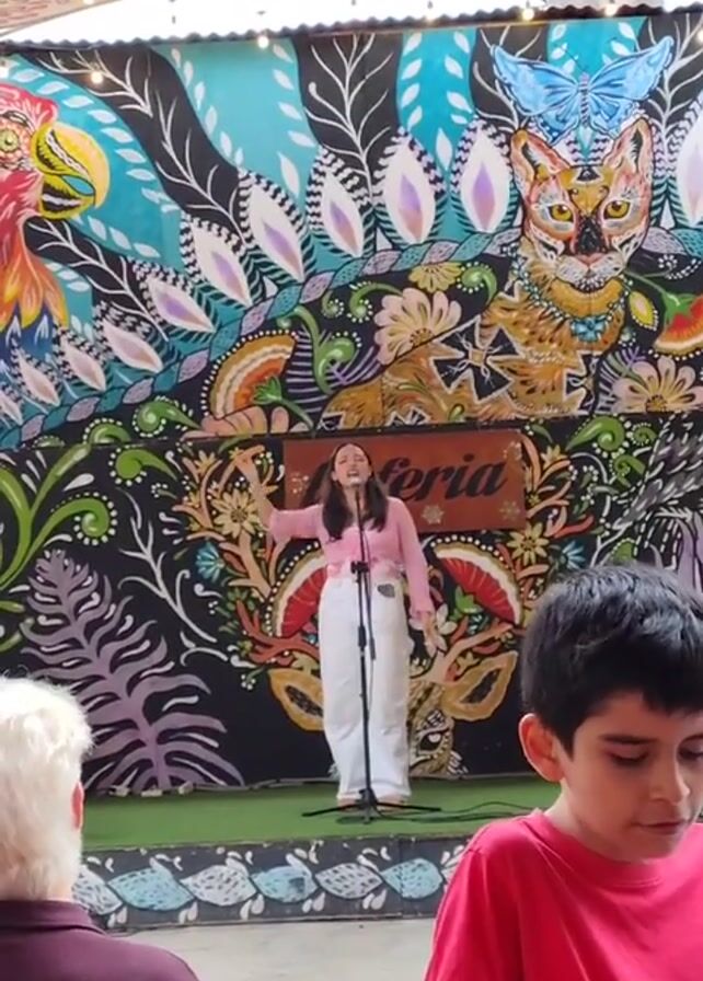 young woman singing in front of a microphone on a small stage. She is wearing a pink cardigan and white pants. Behind her is a colorful mural with images of animals, plants, and the word "Feria." In front of the stage, an audience is seated at tables, including a young boy in a red shirt. The area appears to be an outdoor or semi-outdoor cafe or performance space, with string lights and a patterned ceiling covering.