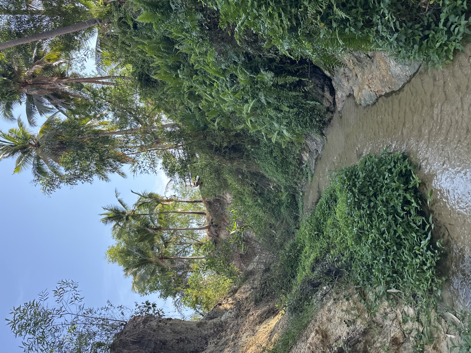 A narrow, shallow river flows through a lush tropical landscape. Dense green vegetation, including ferns and various plants, covers the banks. Palm trees line the edge, reaching towards a clear blue sky. The water is murky brown, contrasting with the vibrant green surroundings. The riverbank is made of light-colored rock and soil, partially obscured by the overgrowth.