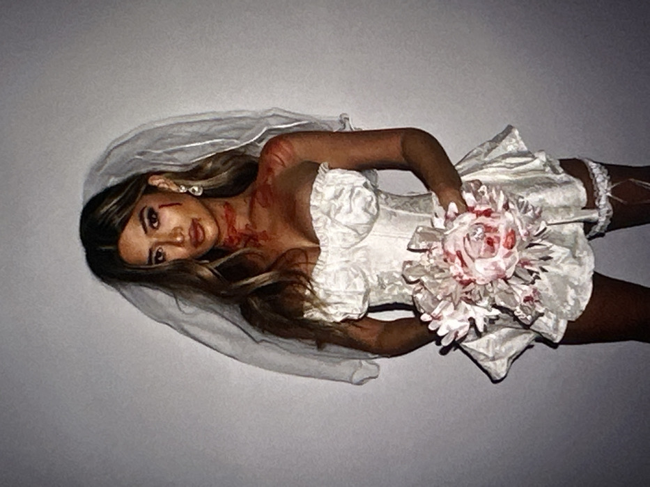 The image captures a single young adult female standing against a plain, light-colored wall in Novosergievka, Russia. She is dressed in a white, strapless, short-length garment resembling a wedding dress, featuring a corset-style bodice and a ruffled skirt. A sheer white veil is draped over her head and shoulders. Simulated bloodstains are visible on her face, particularly below the left eye and on the chin, as well as on her neck and upper chest. She wears dangling earrings and a white lace garter over dark stockings or tights on her left thigh. In both hands, she holds a bouquet of artificial pink and white flowers, which are also stained with simulated blood. Her gaze is directed towards the camera, and her expression is neutral.