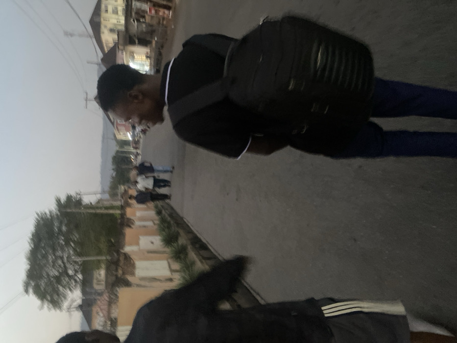 An outdoor street scene in Lokoja, Nigeria, observed during twilight. In the immediate foreground on the left, the blurred back and left side of a person wearing a dark long-sleeved top and grey shorts with white vertical stripes is visible. To the right, slightly forward of center, a young male wearing a dark polo shirt with white collar and trim, dark trousers, and a black backpack is captured from the back and right side, turned to his right and smiling. Ahead of them, on the asphalt street, three male figures walk away from the camera, partially obscured by distance and blur. To the left, a concrete sidewalk borders a drainage channel, beyond which stands a weathered, low orange-colored wall with green foliage behind it. A multi-story building and a large, dense tree are visible further back on this side. To the right, a line of buildings, some appearing commercial with internal lights, extends along the street. Distant hills are visible on the horizon beneath a pale, grey-blue sky. The ambient light indicates dusk or dawn.