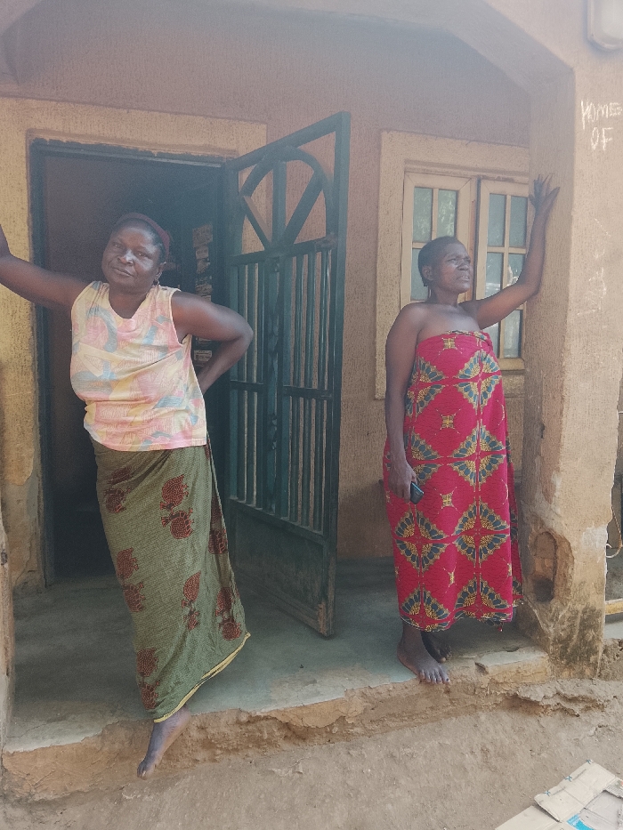 Two adult females stand in front of a light brown building in Akwanga, Nigeria