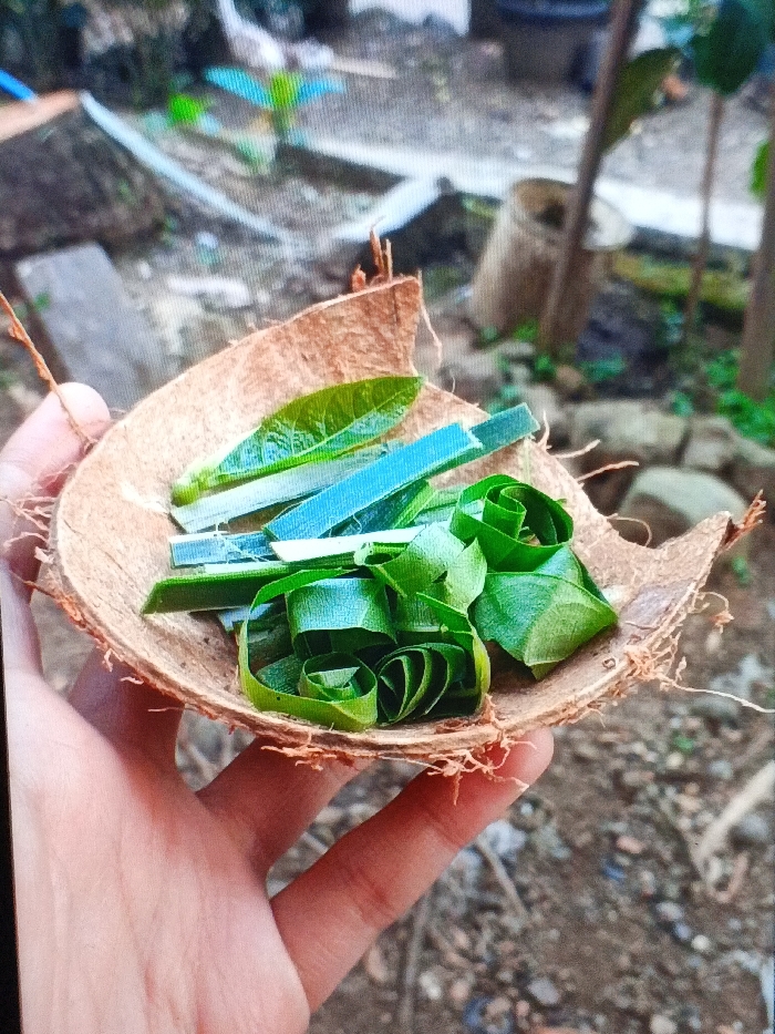 A hand holds a halved coconut shell filled with green vegetation. The shell's rough texture is visible, contrasting with the smooth green strips and rolled leaves. Some pieces are cut into small, rectangular shapes, while others are elegantly curled into rolls. A single, elongated leaf lies flat on the coconut surface. The background shows a blurred outdoor scene with plants and gardening elements.