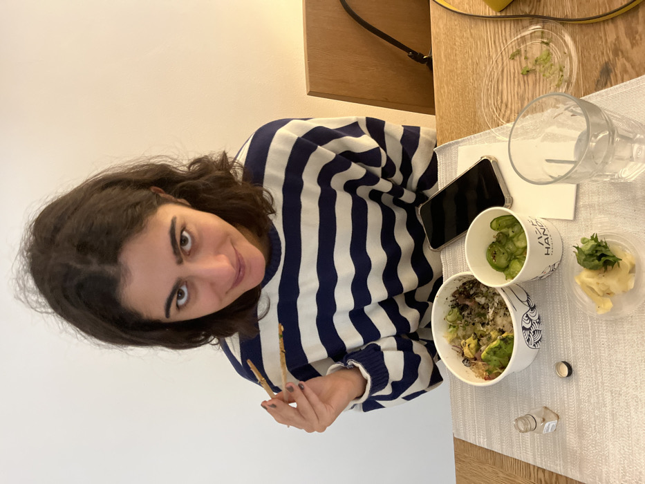 A young adult female, with dark, wavy, shoulder-length hair and wearing a navy blue and white striped long-sleeve sweater, is seated at a light wooden table, looking directly forward