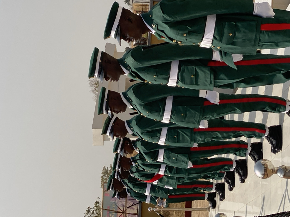 Nine individuals, appearing to be adults, stand in a single file line at attention, facing right, outdoors in Kachia, Nigeria