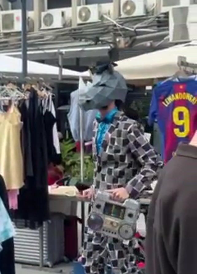 The video depicts an outdoor market setting with clothing and other goods displayed at various stalls. The main subject is a person wearing a rhinoceros mask, a checkered suit, and carrying a boombox. They are moving through the market, interacting with other people. A second person, wearing a giraffe mask and a brown checkered suit, appears briefly in the video as well. The surrounding environment includes buildings with multiple air conditioning units on their walls. People are browsing the stalls, and conversation can be heard in the background.