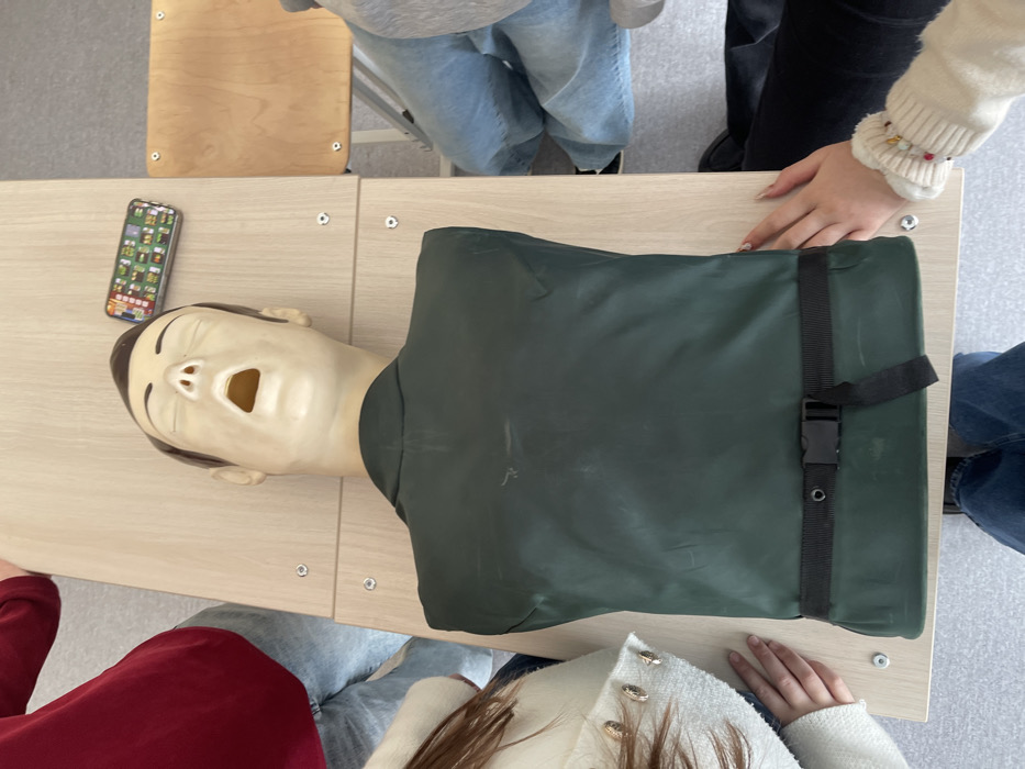 A CPR training mannequin, depicting the upper torso and head, lies supine on a light wood-colored table in an educational or training facility in Nizhnekamsk, Russia