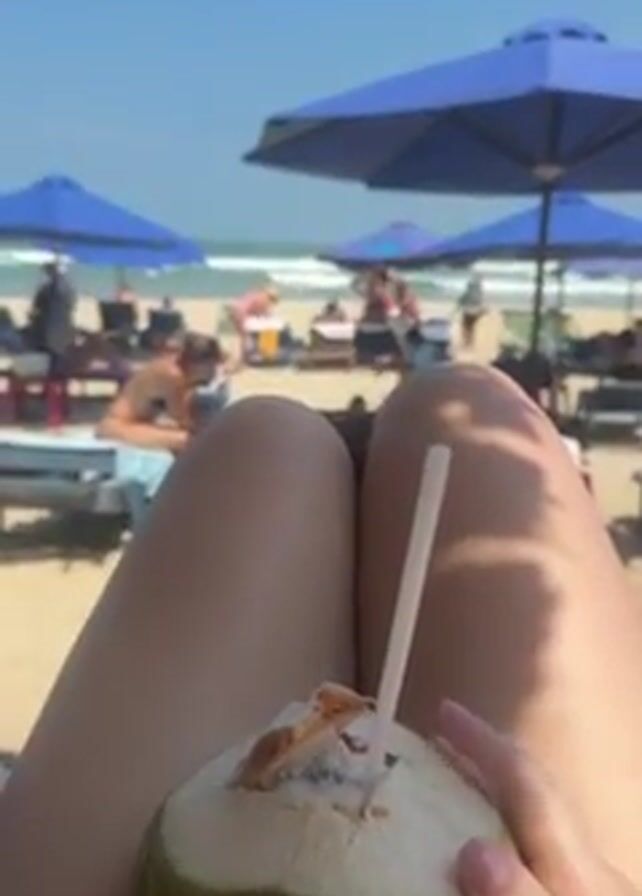 person sitting on a beach chair, holding a coconut with a straw. In the background, there is a beach with several people sunbathing under blue umbrellas. The ocean is visible in the distance under a clear, blue sky. Some people are walking or standing near the water, while others are sitting on lounge chairs, some appearing to be using their phones. The sand is light-colored.