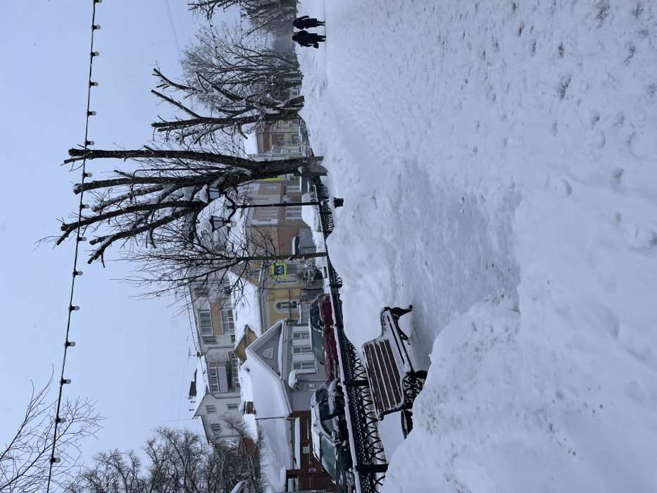 The image captures a winter street scene in Tver, Russia, under an overcast sky. The entire visible landscape, including the ground, paths, and building roofs, is covered in a substantial layer of white snow. In the immediate foreground, a brown wooden slatted park bench with dark, ornate metal legs is positioned on the left, partially obscured by a pile of snow. The paved area immediately in front of the bench shows patches of cleared pavement, possibly ice, surrounded by snow. A wide pedestrian path, completely covered in undisturbed snow with numerous footprints, extends diagonally from the foreground towards the background on the right. Two individuals, both dressed in dark winter coats, are walking away from the viewer along this snow-covered path in the mid-right portion of the frame. Parallel to the path on the left, a black ornamental metal fence delineates the pedestrian area from a street. Beyond this fence, several parked vehicles, including a dark-colored SUV and a red SUV, are visible, all partially covered with snow. A row of heavily pruned deciduous trees, bare of leaves and topped with snow, lines the street. Between these trees, ornate black streetlights with two lamp heads are present. In the mid-ground and background, an assortment of buildings lines the street. These include smaller, older-style residential houses with snow-covered peaked roofs (one light gray with white trim, one yellow with darker trim) and larger, multi-story apartment buildings with balconies, also snow-dusted. A yellow triangular pedestrian crossing sign with a black figure is visible near the street level. Overhead, spanning across the upper portion of the frame, a string of bare, unlit incandescent-style light bulbs is suspended horizontally.