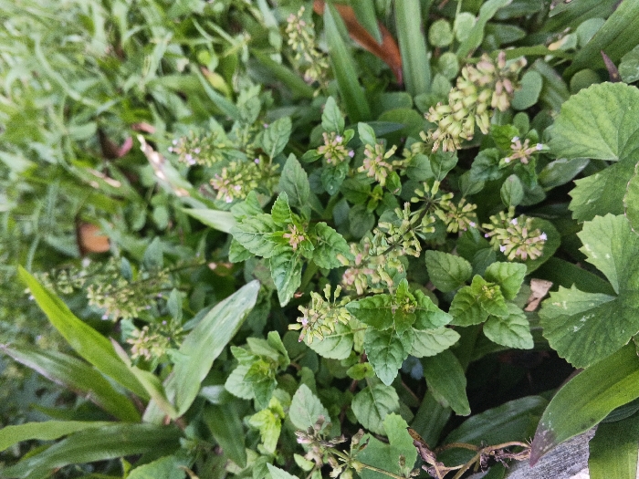 The scene, located in the city of Stueng Saen, Cambodia, displays an overhead, close-up perspective of dense green vegetation. The primary subjects are various herbaceous plants, predominantly featuring clusters of a plant with small, oval to ovate green leaves exhibiting serrated margins. Emerging from these plants are numerous small, tightly clustered inflorescences, appearing in shades of pale green and light pink. Interspersed among these are other green plants, including some with elongated, strap-like leaves and at least one plant possessing a larger, lobed leaf with lighter green variegation. The foliage completely fills the frame, indicating a ground-level view of a vegetated area. No people, animals, or man-made objects are visible. The lighting is diffused, suggesting natural ambient light without harsh shadows.