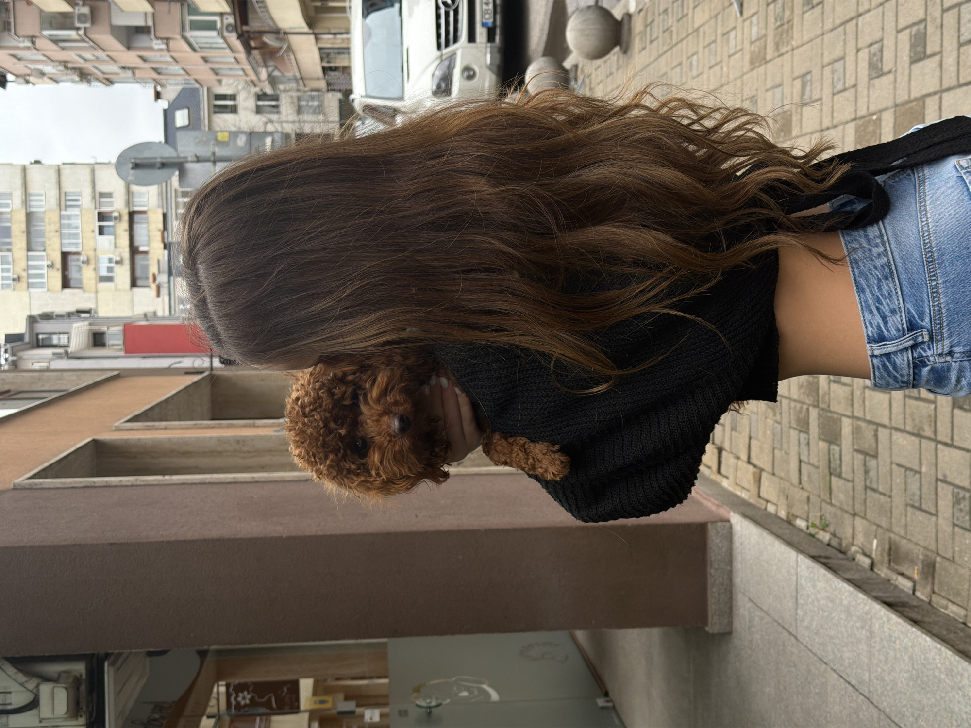 A young woman stands on a paved sidewalk in Sofia, Bulgaria, cradling a small, brown poodle in her arms. The woman has long, wavy brown hair that cascades down her back. She is wearing a black sweater and blue denim shorts. Her left arm is visible, wrapped around the dog. The background shows a typical urban scene with buildings of varying heights and architectural styles. The buildings are predominantly beige and white. A white van with Bulgarian license plates is visible behind the woman's head. A street sign is also visible in the background. The sidewalk appears to be made of square gray pavers.