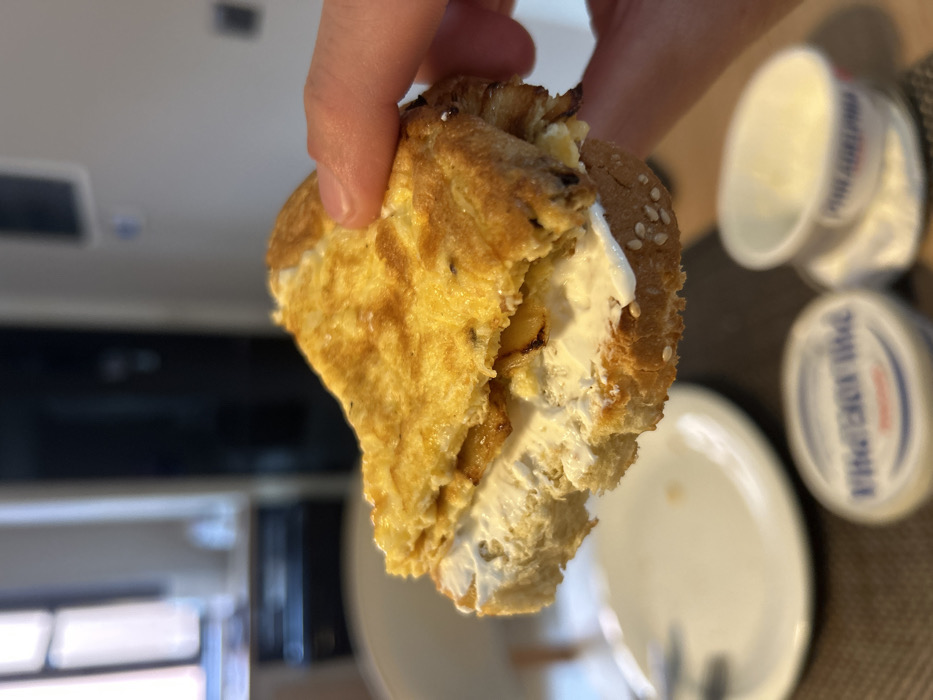 The scene depicts an indoor setting, likely a kitchen or dining area, located in the city of Archanes Municipal Unit, Greece. A person's right hand holds a partially consumed sandwich. The sandwich is constructed with a bottom layer of bread, possibly a baguette slice, featuring visible sesame seeds on its crust. This bread is liberally spread with a white, creamy substance, identified as cream cheese. Layered atop the cream cheese are several pieces of translucent, golden-brown caramelized onions. The topmost layer is a folded, golden-yellow omelet, exhibiting slight browning and dark specks, possibly herbs. A bite has been taken from the front-left portion of the sandwich. In the blurred mid-ground, on a dark, textured surface, a white dinner plate and a metallic utensil (fork or knife) are visible to the left. To the right, two white plastic containers of "Philadelphia" brand cream cheese are present; one is closed and clear, while the other is open and partially utilized. The background is blurred, showing a window with natural light entering from the left and dark furniture or appliances on the right.