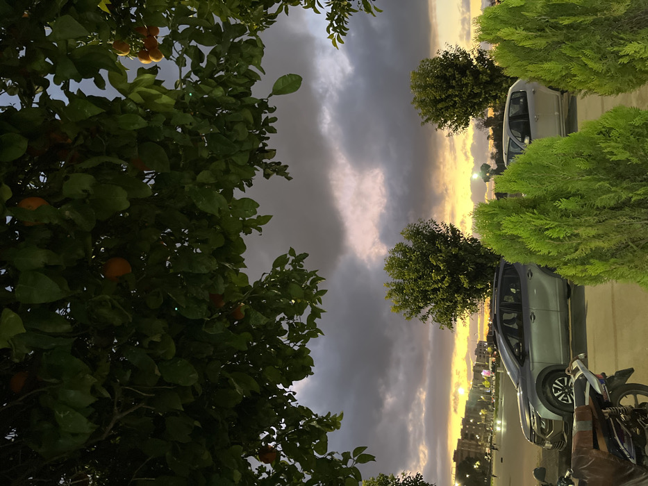 A twilight cityscape with a dramatic sky of dark clouds streaked with golden light. Lush trees with oranges frame the left side, while neatly trimmed shrubs border the right. Two parked cars and a motorcycle are visible along the roadside. Distant buildings are silhouetted against the glowing horizon, completing the scene.
