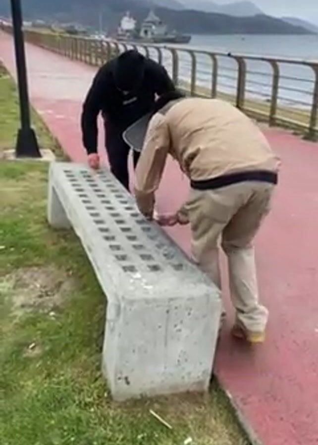 Two men stand next to a concrete bench along a waterfront walkway. The man on the left wears a black beanie and a black sweatshirt. The man on the right wears a tan jacket and khaki pants. They both seem to be examining the surface of the bench. The man on the right has a skateboard in his hand. A red walking path and a grassy area run along the left edge of the frame. A metal railing borders the walkway on the right. Beyond the railing is the ocean and a large ship. Mountains are visible in the background. The sky is overcast.