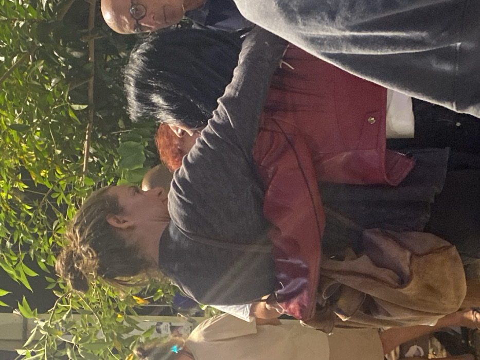 The image depicts an intimate outdoor scene at night in Tel Aviv, Israel, focusing on two women embracing. In the center, a woman with light brown hair pulled into a messy bun, wearing a dark gray long-sleeved top and carrying a light brown shoulder bag, has her arm around the shoulders of another woman. This second woman, with long dark hair, is seen from behind, wearing a red leather-like jacket over a white garment. Her arm is also wrapped around the first woman's back. Both women appear engaged in a close embrace. To the far right, a bald man with round glasses and a dark shirt observes the scene, looking towards the left. Partially visible on the far left, another woman in a light-colored, possibly beige, top has an illuminated blue-green earring. A person with reddish-brown curly hair is partially visible between the two embracing women and the man on the right. The background consists of dense green foliage, suggesting trees or bushes, under artificial lighting against a dark night sky.