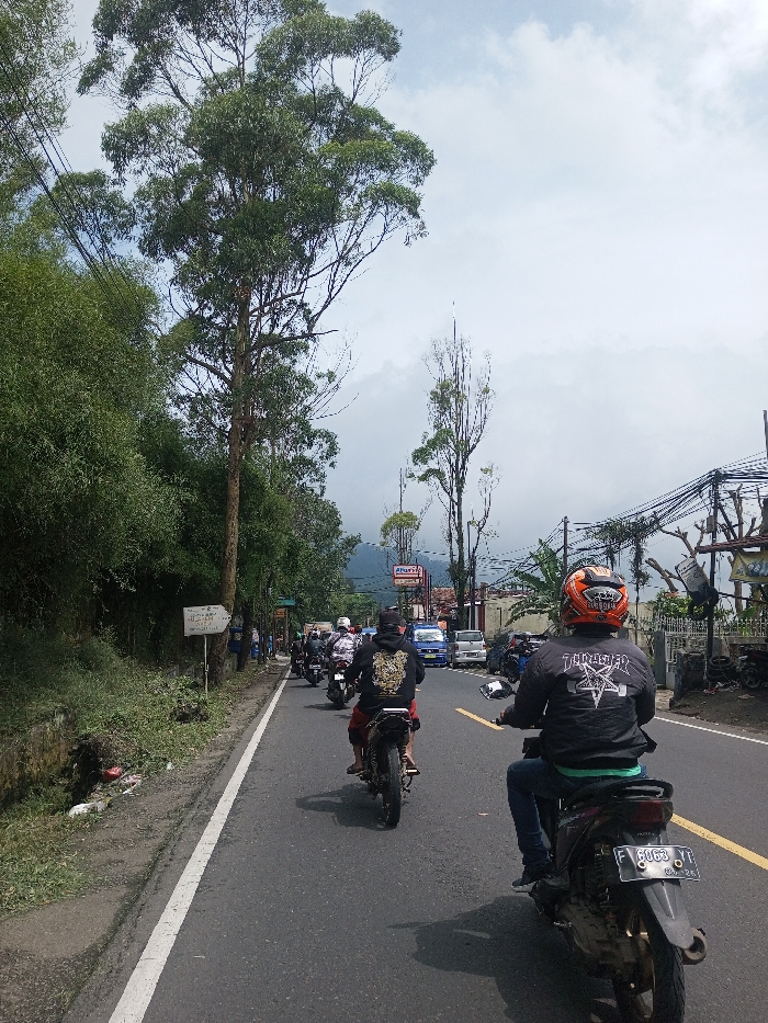This image depicts a street scene in the city of Sandamal Eliya, Sri Lanka. The perspective is from behind a moving motorcycle, looking down a two-lane asphalt road with a solid white line on the left edge and a faded yellow line separating lanes. The sky is overcast with visible clouds, and distant hills or mountains are partially obscured by atmospheric haze. In the immediate foreground, the rear of a dark-colored motorcycle is visible, with a license plate "F 6063 T" and blue lettering on white. The rider, facing away from the camera, wears blue jeans, a black jacket with a white pentagram and the word "THRASHER" printed on the back, and an orange and black full-face helmet. Ahead of this motorcycle, another rider is visible on a dirt bike-style motorcycle. This individual wears red shorts and a black hoodie with a large, elaborate gold-colored design on the back. Further down the road, a line of several other motorcycles and riders is observed, some wearing helmets, others not clearly visible. To the left of the road, a steep, overgrown embankment is present, densely covered with green foliage and tall, slender trees, possibly eucalyptus. A white directional sign on a wooden pole is partially visible on this side. To the right of the road, structures and infrastructure are present. Multiple utility poles with numerous black power lines or cables crisscross the upper right portion of the image. Further down, buildings with red and brown roofs are visible, along with what appears to be a small commercial sign, possibly for a convenience store, and several parked vehicles, including a blue car and a silver/white car. Sparse, tall trees with fewer leaves are also visible on the right side.