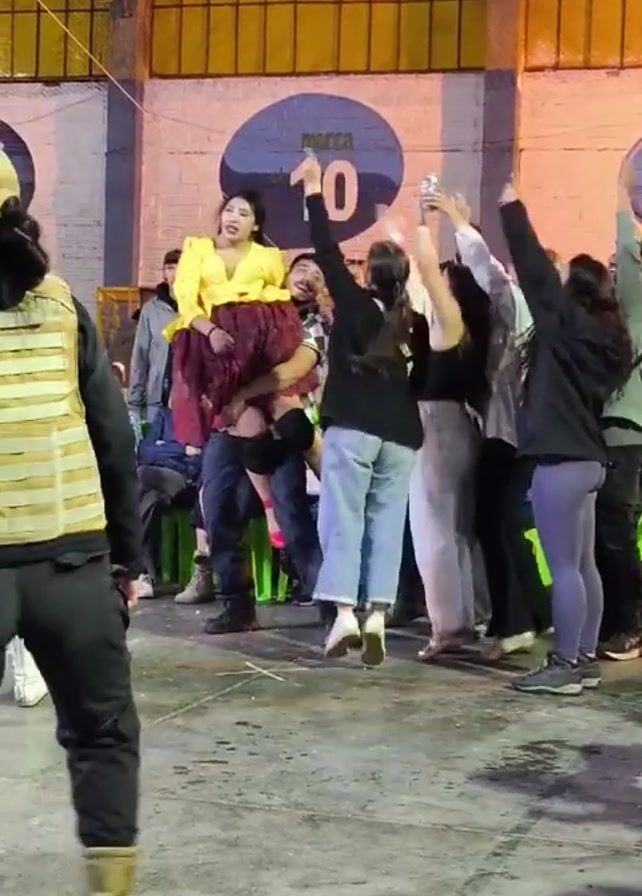 group of people in an indoor space. A person wearing a yellow top and a maroon skirt is lifted onto someone's shoulders in the middle of the group. Most of the other people in the group are raising their hands in the air. In the foreground, a person wearing a tan vest and cap stands facing the group. In the background, there are people seated watching, and a wall with a blue circle containing the number 10. The floor appears to be concrete. The video seems to be taken with a handheld device.