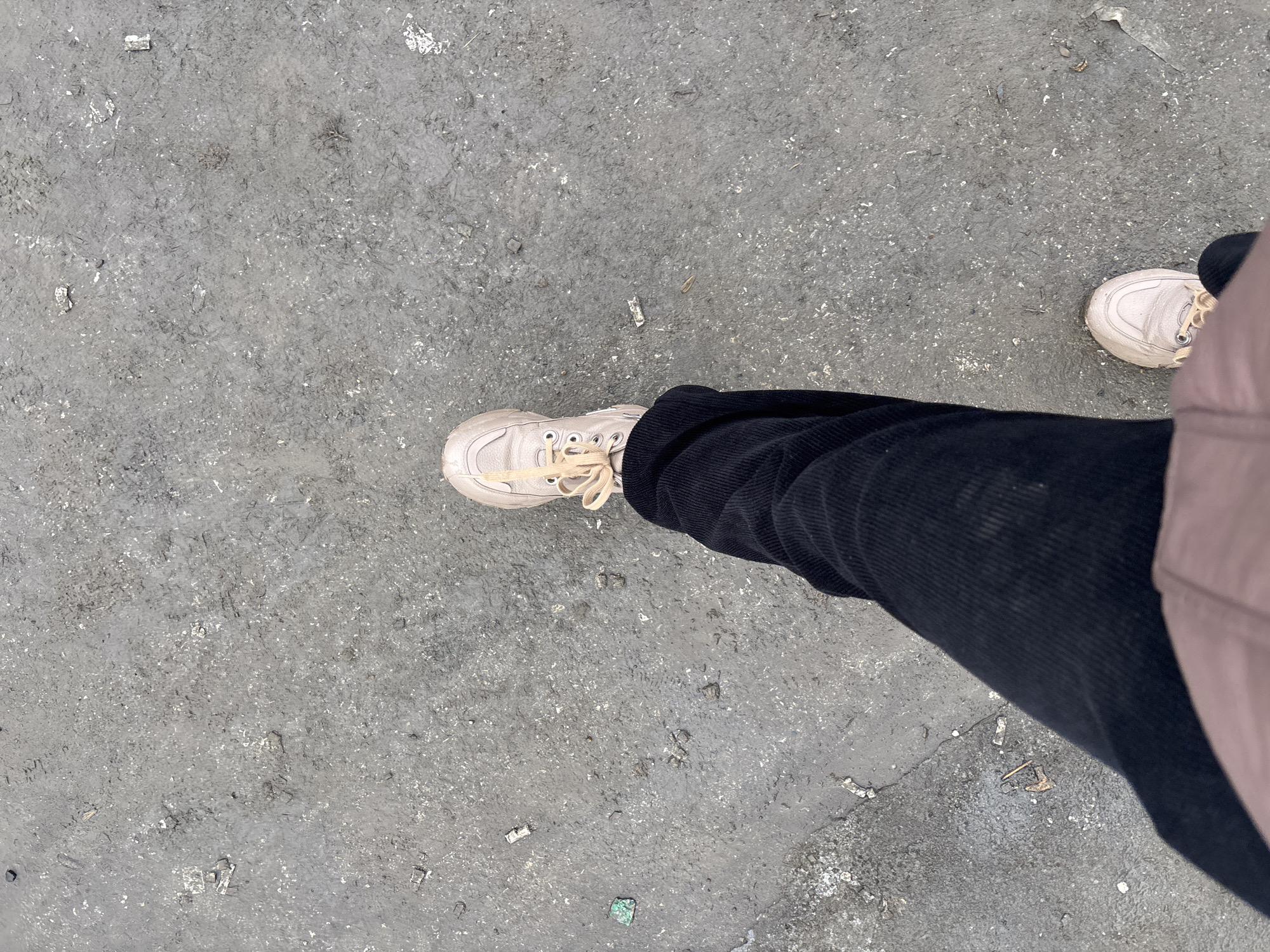 The image, taken from an overhead perspective in the city of Фролы, Russia, depicts the lower extremities of an individual standing or walking on a rough, dark gray ground surface. The subject is wearing dark, corduroy trousers and light beige chunky athletic shoes with matching laces. The right foot is positioned centrally and slightly forward, indicating a walking motion or a momentary pause. The left foot is partially visible towards the bottom right. The ground surface, consistent with worn asphalt or compacted dirt/gravel, is uneven and sparsely littered with various small debris, including white fragments, dark organic matter, and small pieces of litter such as a green fragment on the left side.