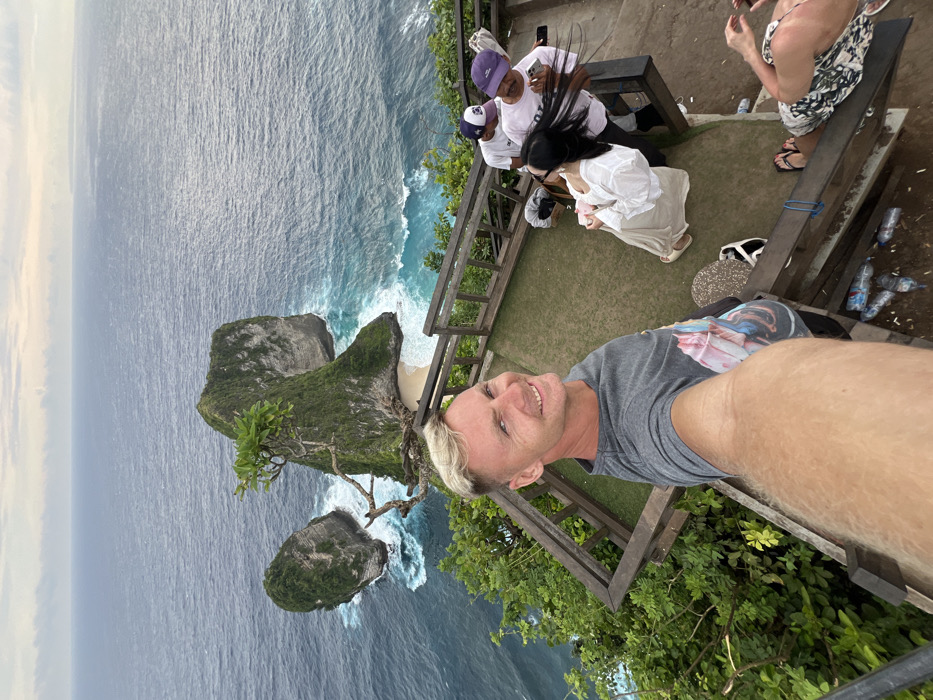 A high-angle selfie photograph captures a male subject and a group of individuals on a cliffside viewing platform at Kelingking Beach, located in Bunga Mekar, Indonesia
