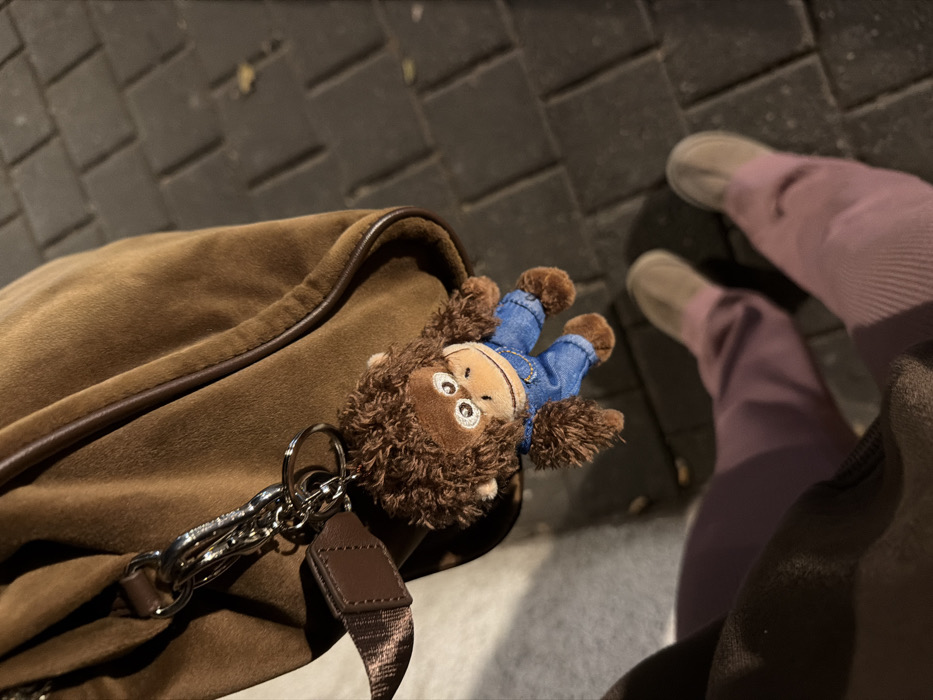 A brown, velvet-like bag sits on a dark brick surface, with a stuffed monkey keychain attached. The monkey wears a denim outfit and hangs upside down. The bag's chain and leather strap are visible. In the background, a person wearing light gray shoes and mauve pants stands. The bag is prominently featured, while the person is partially cropped and out of focus.