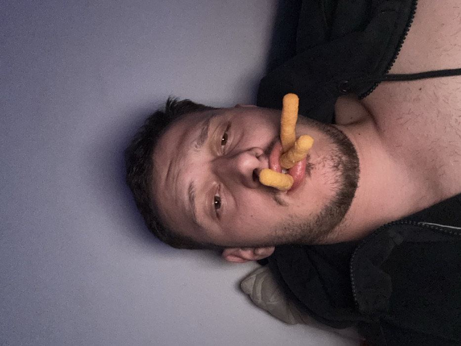 The image depicts a close-up, head-and-shoulders shot of an adult male in an indoor setting. The individual, appearing to be in their 20s or 30s, has short dark hair and stubble/short beard. Their eyes are open, looking directly towards the camera. Multiple orange, cylindrical, puffed snack items, consistent with cheese puffs, are held between their lips, protruding outwards. The individual is wearing a dark-colored garment, possibly a jacket or hoodie, visible around the neck and shoulders. A lighter-colored object, possibly a pillow or another garment, is visible behind their left shoulder. The background consists of a plain, light blue-grey wall, illuminated by what appears to be an artificial light source, casting a shadow above the subject's head. The overall lighting is dim. The specific location within the city of Sofia, Bulgaria, is not discernible from the visual information provided within this indoor scene.