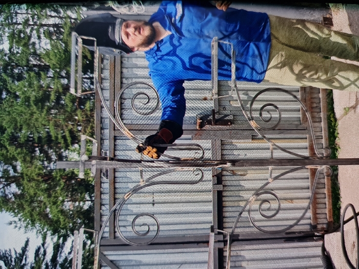 An adult male stands outdoors in Chaikovsky, Russia, holding a piece of ornate metalwork. He is positioned slightly right of center, wearing a blue long-sleeved shirt, light-colored pants, and dark work gloves with orange palms. A black welding helmet rests on his head, with the visor lifted, revealing his bearded face and an open mouth. His right hand, gloved, supports a tall, dark metal structure featuring intricate scrollwork and a central vertical bar, displaying signs of surface rust. In the background, a corrugated gray metal fence or gate with a visible latch extends across the scene, exhibiting weathering and rust near its base. Above the fence, several green coniferous trees are visible against a bright sky. The ground consists of light-colored pavement with interspersed dirt and sparse vegetation, and a dark hose or cable is partially visible on the left.