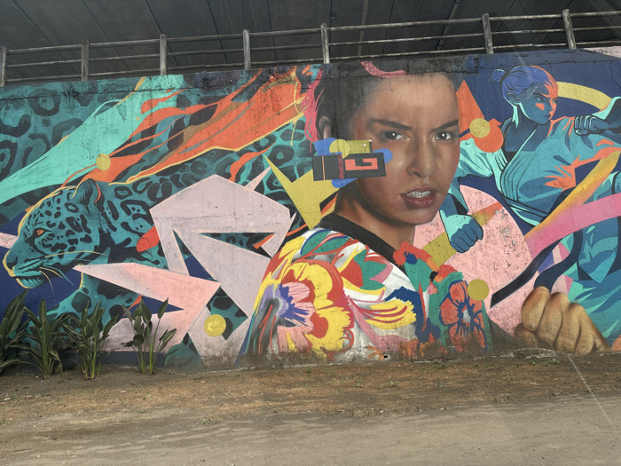 Vibrant mural art graces a concrete wall. A jaguar's head is positioned on the left. Centered is a realistic portrait of a woman with a determined expression. Geometric shapes and color bursts surround her. A second woman in a martial arts stance occupies the right. Earth and greenery are seen at the base of the wall, with a metal railing above. The overall style is a mix of realism, abstract, and graphic elements.