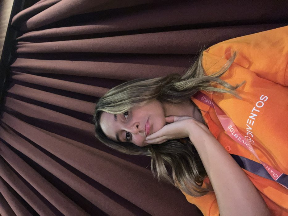 A young female is positioned centrally, facing the camera. She has long, light brown hair with blonde highlights, parted in the middle. Her right hand, with fingers slightly spread, rests against her right cheek and jawline. Her cheeks are visibly distended, and her lips are pursed. She is wearing an orange polo shirt, partially unbuttoned at the collar, and a red lanyard featuring white "DIVENTOS" text and a logo is visible around her neck. The background consists of a dark brown, vertically pleated curtain, illuminated to show variations in light and shadow. The scene is located in Aldoar, Foz do Douro e Nevogilde, Portugal.