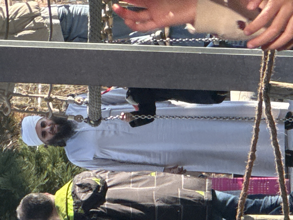 The image displays an outdoor scene in Reichstett, France, with four individuals present, situated within a playground or adventure park environment under bright daylight. In the center, an adult male stands facing the viewer. He wears a white turban, a long, light-colored thobe or tunic, and has a dark, full beard. His right hand is positioned near a vertical metal chain, which is part of an adjacent play structure. To his left, the back of another individual is partially visible, dressed in a dark jacket with a yellow-green hood lining and blue jeans. In the blurred foreground on the extreme right, the hands and forearm of a child are visible. In the upper right background, a fourth person is partially seen, wearing a light-colored shirt and blue jeans, positioned on a suspended rope or net structure. The environment features elements of a play area, including braided ropes running horizontally, vertical metal chains, and a prominent dark grey vertical support beam on the right side of the frame. Green foliage is visible in the background, along with additional rope and wooden structures suggesting a climbing or play area. A purple object, possibly a crate, is partially visible in the lower-left background. No explicit interactions between the primary visible figures are discernible.