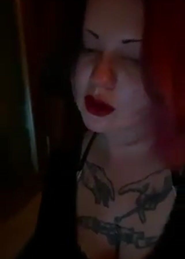 A woman with reddish pink hair and dark lipstick is seen up close, drinking from a large wine glass. She is wearing a black top that reveals tattoos on her chest, including depictions of hands and what looks like a chain or fence. The lighting is dim and red. The background is dark.
