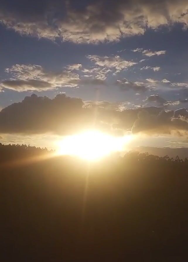 bright, cloud-obscured sunrise or sunset. The sun is largely hidden behind thick clouds, casting golden light and rays across the scene. Silhouetted in the foreground is a dark, hilly or mountainous area covered in trees. The sky above the clouds is a light blue with scattered, smaller clouds. The camera is static throughout the video.