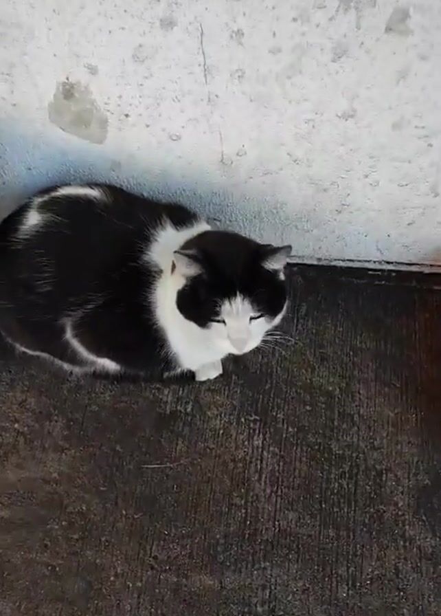 A black and white cat is sitting on the ground next to a light gray wall. An orange flower pot is on the left side of the cat, and a similar orange object is on the right side. The cat opens its eyes, closes them again, and then opens them once more.