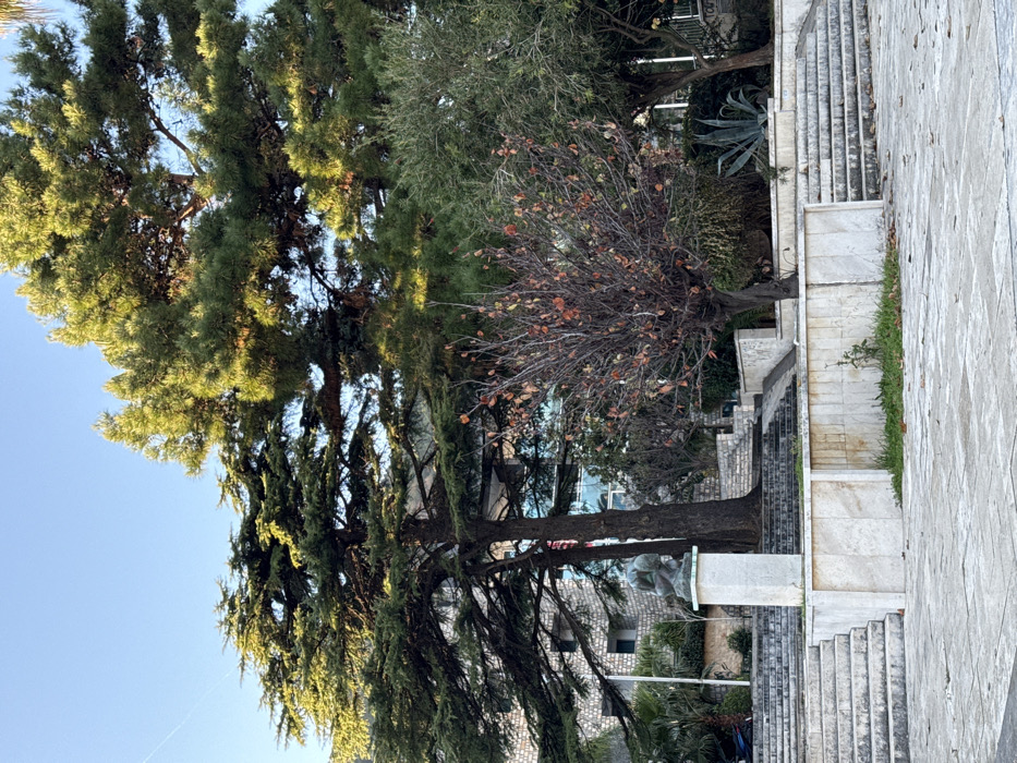 The image displays an outdoor public area in Budva, Montenegro, specifically a multi-level plaza or park identified by the prominent bronze "Dancer from Budva" statue. The scene is illuminated by direct natural sunlight under a clear, pale blue sky, with a faint white contrail visible in the upper left quadrant. The foreground is composed of a light-colored, square-tiled paved surface. This area transitions into a series of multi-level steps and retaining walls constructed from similar light-toned, possibly marble or granite, tiles. A central subject is a bronze statue of a female figure, approximately 1.5 meters tall, depicted in a crouching or stretching posture. This statue rests atop a rectangular white stone pedestal, positioned at the base of a wide set of stairs on the lower level of the plaza. Surrounding the architectural elements, the environment features diverse vegetation. Several large evergreen trees, exhibiting dense green foliage consistent with conifers, dominate the upper and mid-ground. To the right of the statue, a smaller deciduous tree with mostly bare branches and scattered dry, reddish-brown leaves is visible. Further right, a greener, smaller tree and a large blue-green agave plant are present within landscaped sections. In the background, behind the trees and elevated sections of the plaza, multi-story buildings are visible. One structure presents a light-colored stone or stucco facade with multiple rectangular windows, some displaying reflective blue-tinted glass. No individuals, animals, or vehicles are present in the frame. No discernible actions or interactions are occurring.