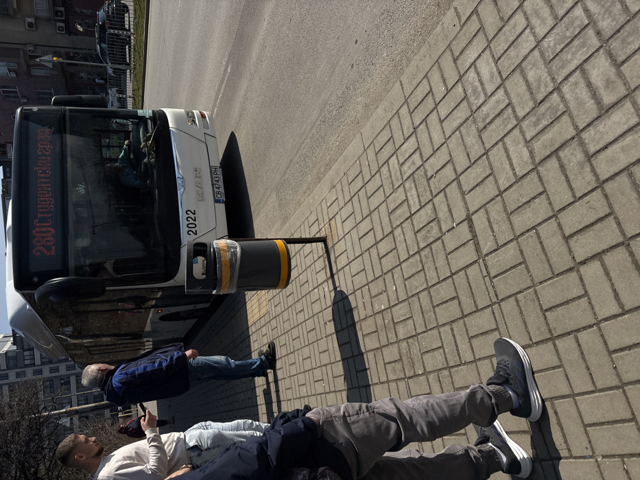 A daytime photograph depicts an urban bus stop scene. A white MAN city bus, model year 2022, bearing license plate "CB 4743 PH" and displaying "280C Студентски град" on its destination sign, is stationary at an asphalt road curb. On the adjacent grey paver sidewalk, a grey cylindrical trash can with a yellow band is present. Three adult males are visible on the sidewalk: one in grey trousers and black athletic shoes (partially visible in the foreground), one wearing a light-colored shirt and light blue jeans holding a smartphone, and an older man in a dark blue jacket and blue jeans facing the bus. A fourth person is partially visible in the distant background. A bus driver in a light blue shirt is visible within the bus. The scene is brightly lit by natural sunlight, casting distinct shadows. Multi-story buildings and bare trees are present in the background.