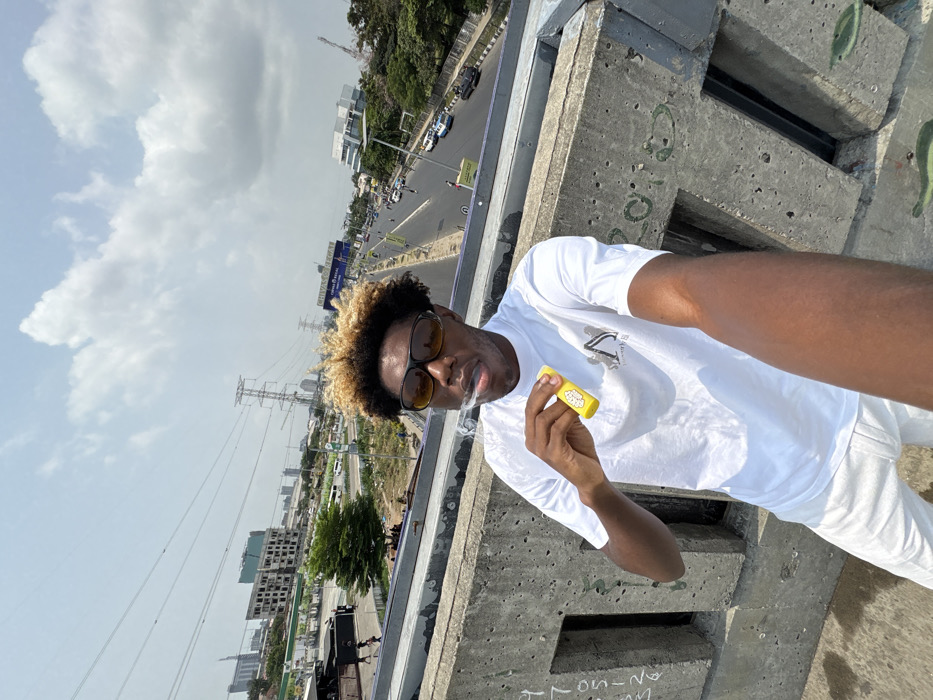 A young Black male is captured in a selfie from an elevated concrete structure in Ilado, Nigeria