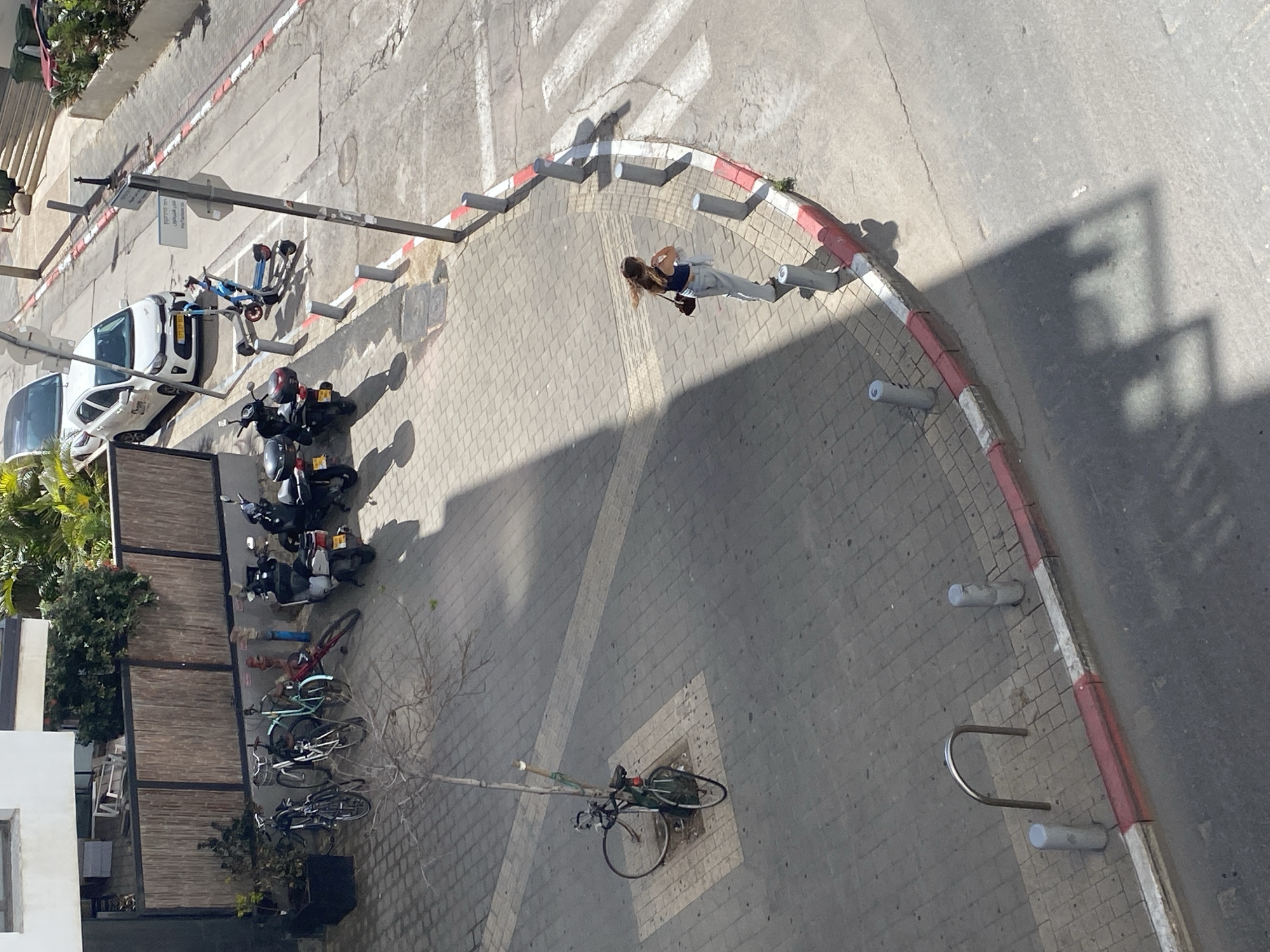 The image, taken from an elevated viewpoint, shows a section of a street in Tel Aviv, Israel. A woman walks along a paved path defined by a red and white curb. Several motorcycles and parked bicycles are adjacent to a building with trees and vegetation in front of it. A few scooters are near a parked white car by the side of the road. The environment includes shadows cast by the sun, typical of urban streets with buildings. A crosswalk is visible at the top of the frame. A bicycle parking rack is in the lower right section of the image.