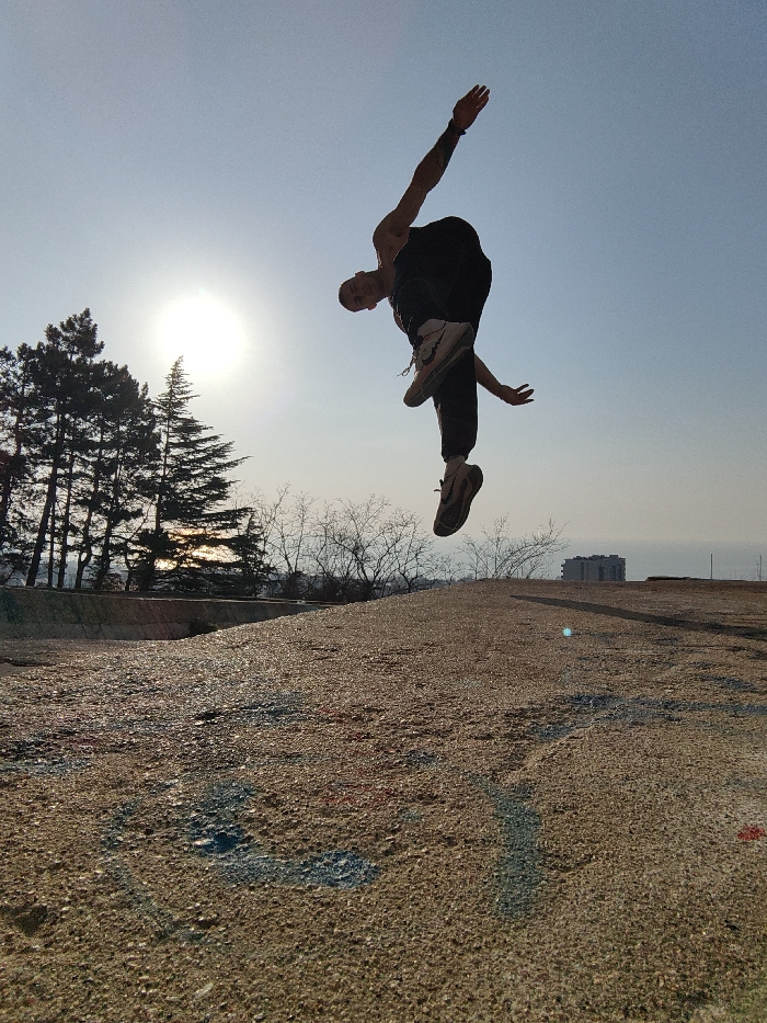 A single individual, a male, is captured mid-air in an inverted, acrobatic pose against a clear, light blue sky. He wears a dark sleeveless top, dark baggy pants, and light-colored athletic shoes on his left foot, with a darker shoe on his right. His body is bent at the waist, head tilted downwards facing the camera, right arm extended upwards and slightly outwards, and his left arm bent with the hand near his left hip. A tattoo is visible on his right forearm. The bright, circular sun is positioned behind and to the left of the subject, creating a partial silhouette and a lens flare. In the mid-ground, to the left, a cluster of dark green coniferous trees stands silhouetted against the sun. To the right of these, sparser, bare deciduous trees are visible. A curved, light-colored concrete or stone structure, possibly a retaining wall or drainage feature, runs horizontally behind the trees. The foreground consists of a rough, light brown or tan ground surface, appearing to be gravelly concrete or packed earth, with faint blue and red spray paint markings. In the distant background, to the right, a body of water, identified as the Black Sea, meets the horizon. A multi-story building is visible on the distant coastline, silhouetted against the hazy sky above the water. The scene is located in an elevated outdoor area of Varna, Bulgaria, providing a vantage point overlooking the Black Sea and portions of the city.