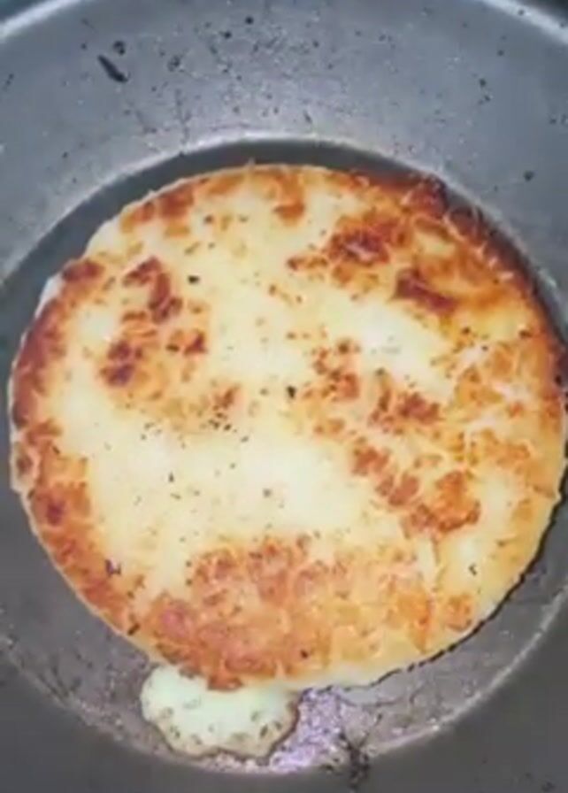 A top-down shot shows a cooked arepa in a frying pan. The arepa is a golden color with some browned areas. A small amount of melted cheese is visible on the left side of the arepa. The frying pan is made of a gray-colored metal and has some dark spots and scratches on its surface. The stove top is visible around the edges of the pan.